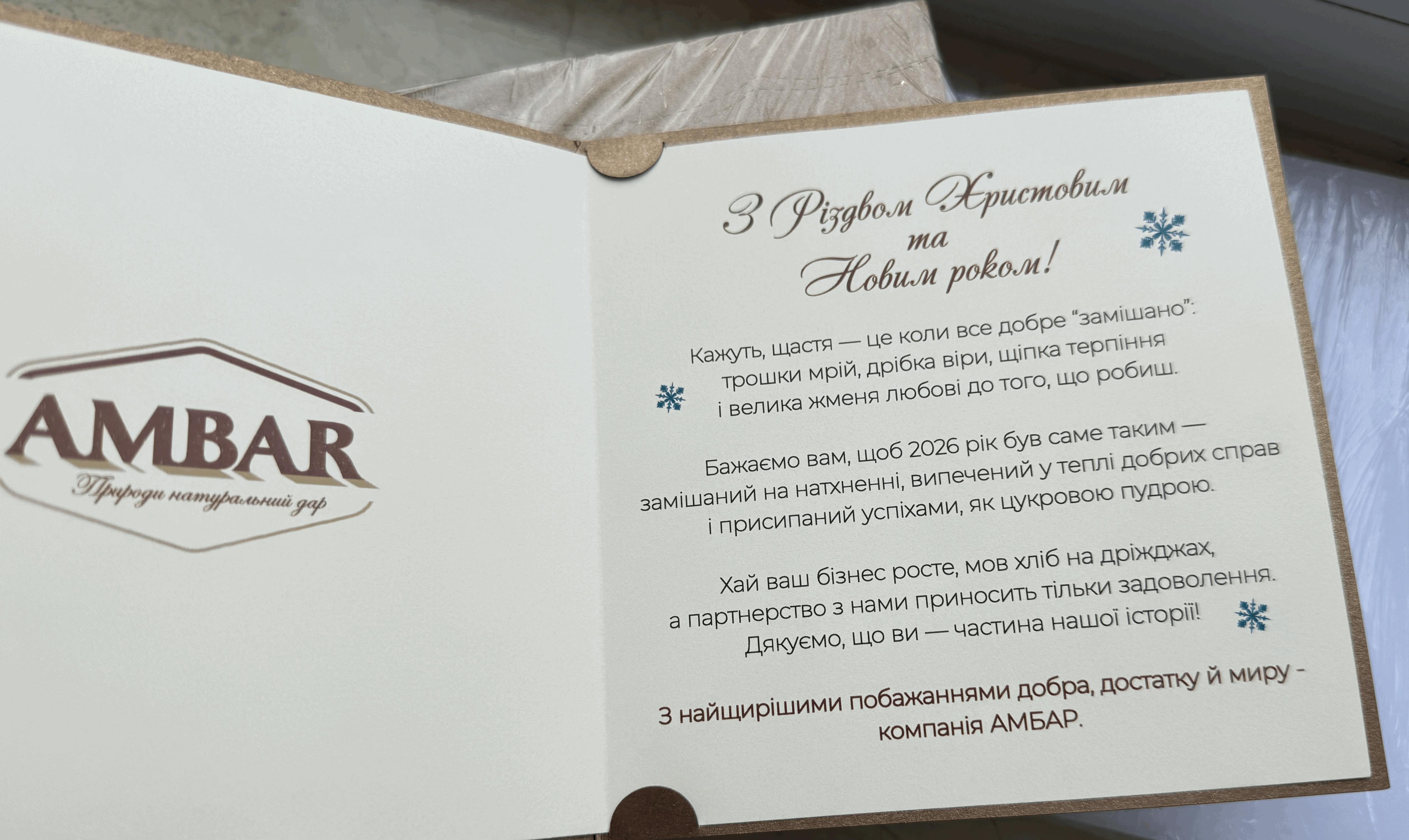 Отримали листівки для партнерів — виглядають просто чудово! Якісний друк, приємні матеріали, стильний дизайн. Все зроблено вчасно й професійно. Дякуємо за відповідальний підхід і увагу до деталей! + вклали спеціальні конверти для листівок, що стало приємним бонусом)))