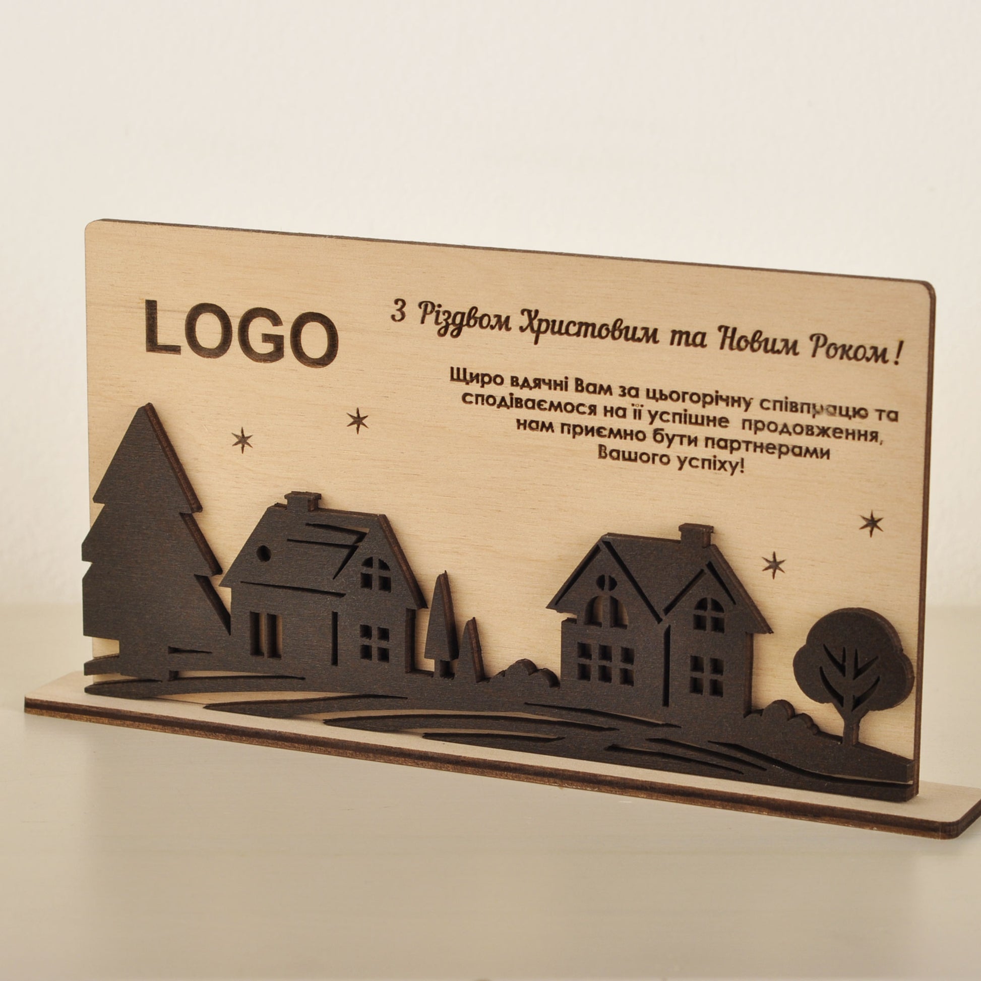 Дерев'яна новорічна листівка з логотипом та текстом на підставці 130308