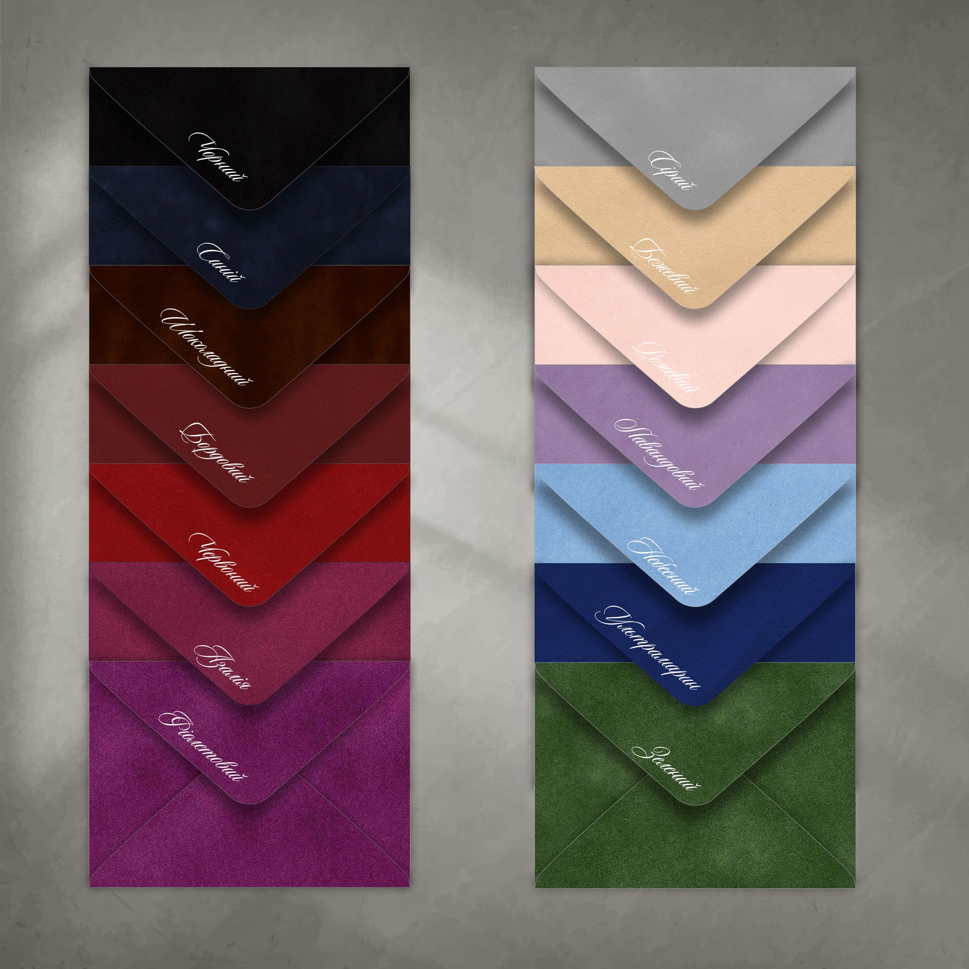 Дизайнерські конверти широко використовуються для підкреслення корпоративного стилю та загальної кольорової теми весілля та інших заходів. Тому ми пропонуємо широкий вибір кольорів дизайнерського картону, що можна обрати одразу на сайті при замовленні.