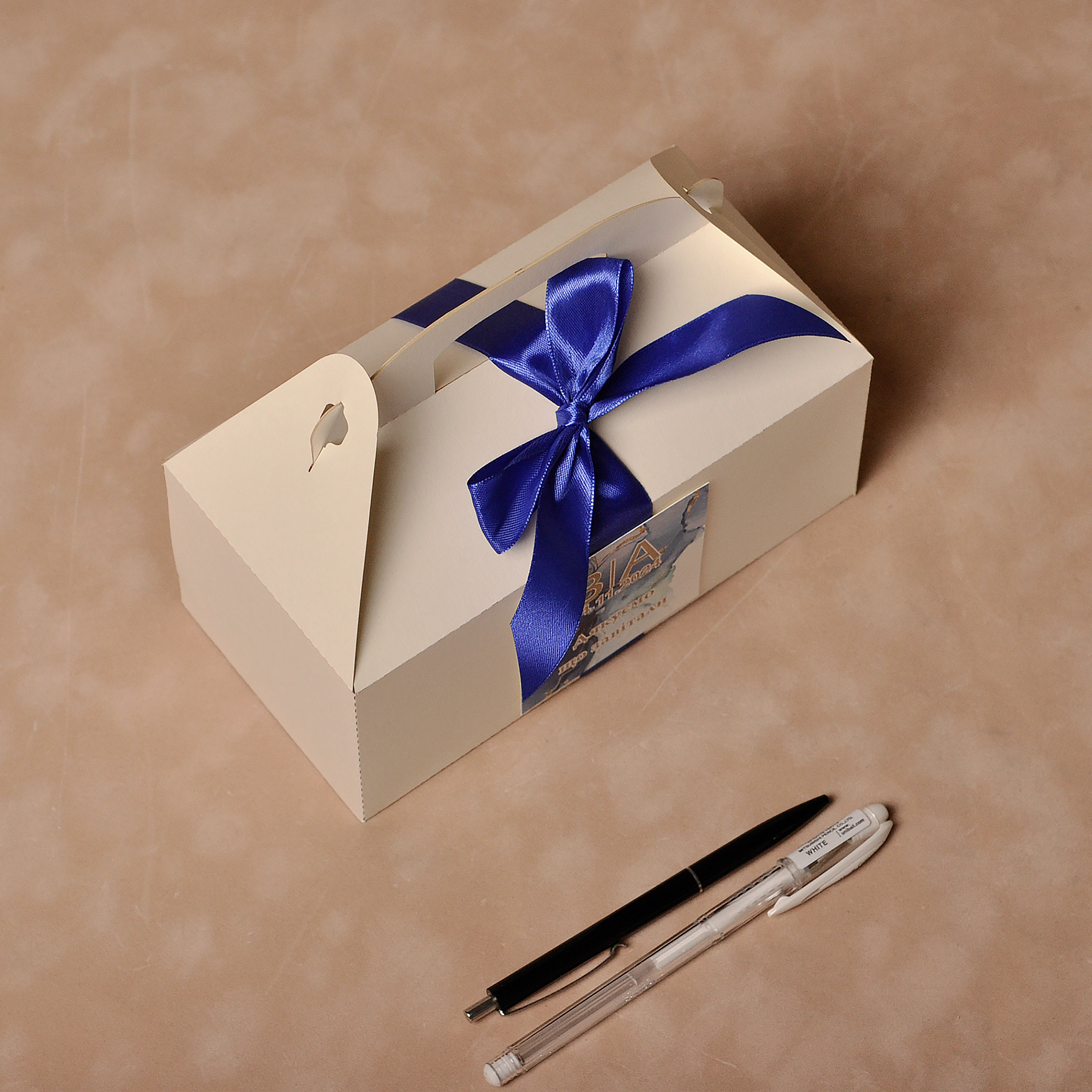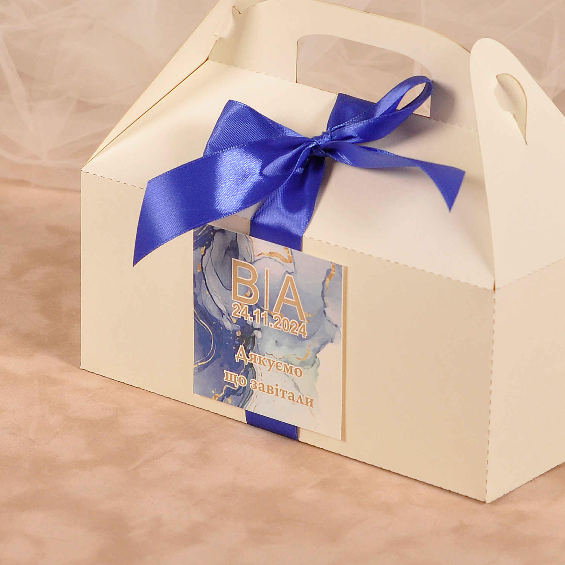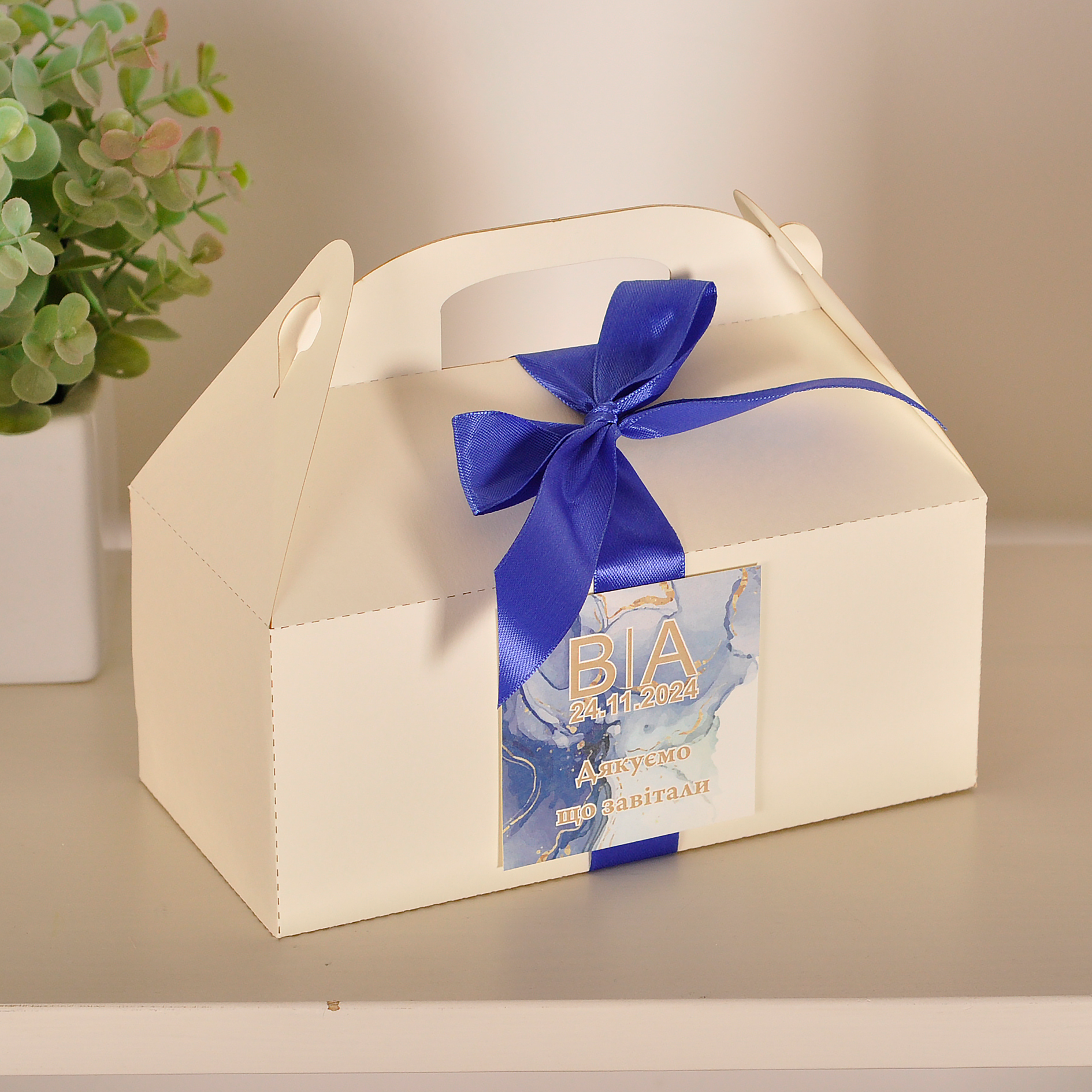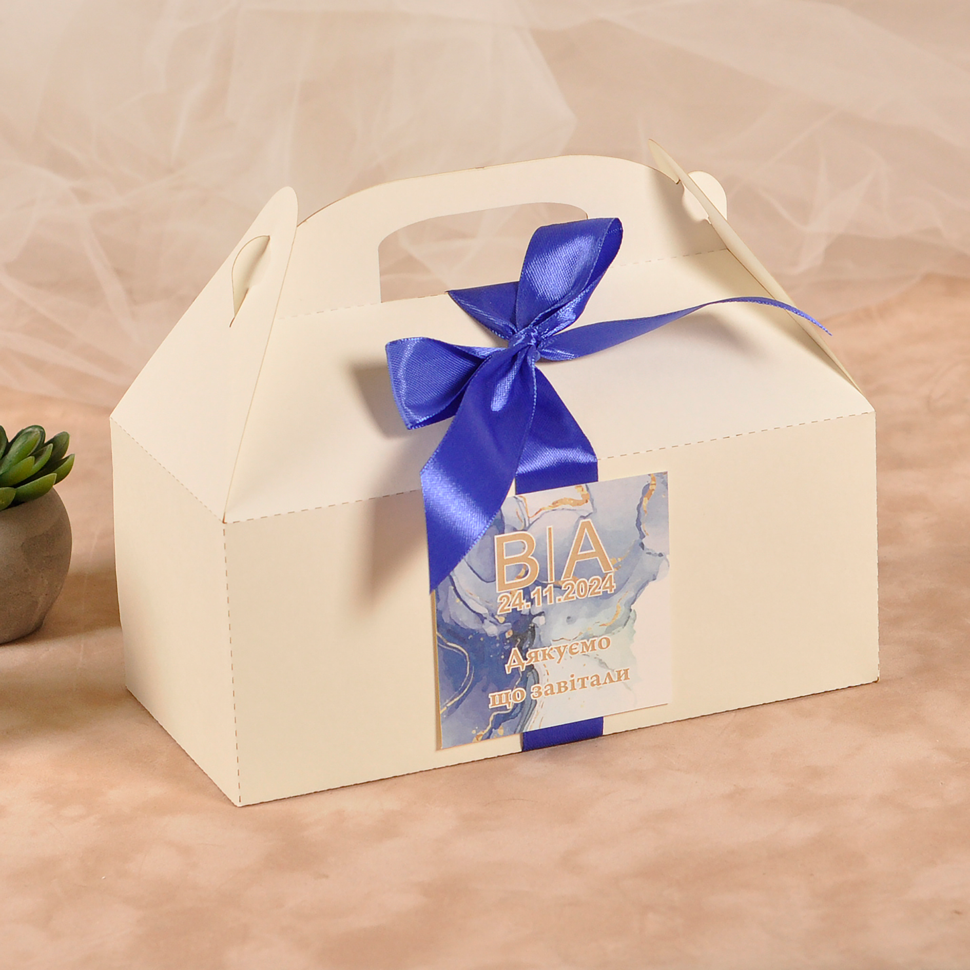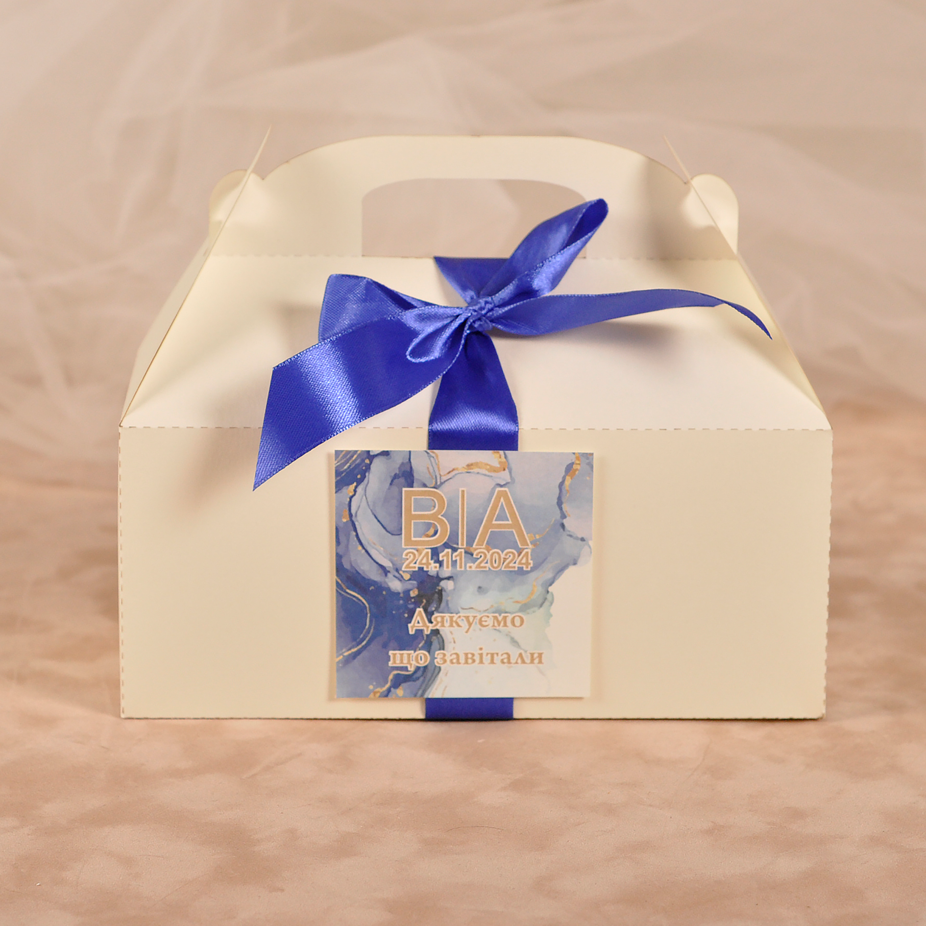 На передній частині коробки для тортів наносяться ініціали і дата весілля. Виготовляється з матового дизайнерського картону кольору айворі. Прикрашена синьою стрічкою, що зав'язується на бант. Під замовлення можливо виготовлення в інших кольорах. Також доступна заміна кольору стрічки.