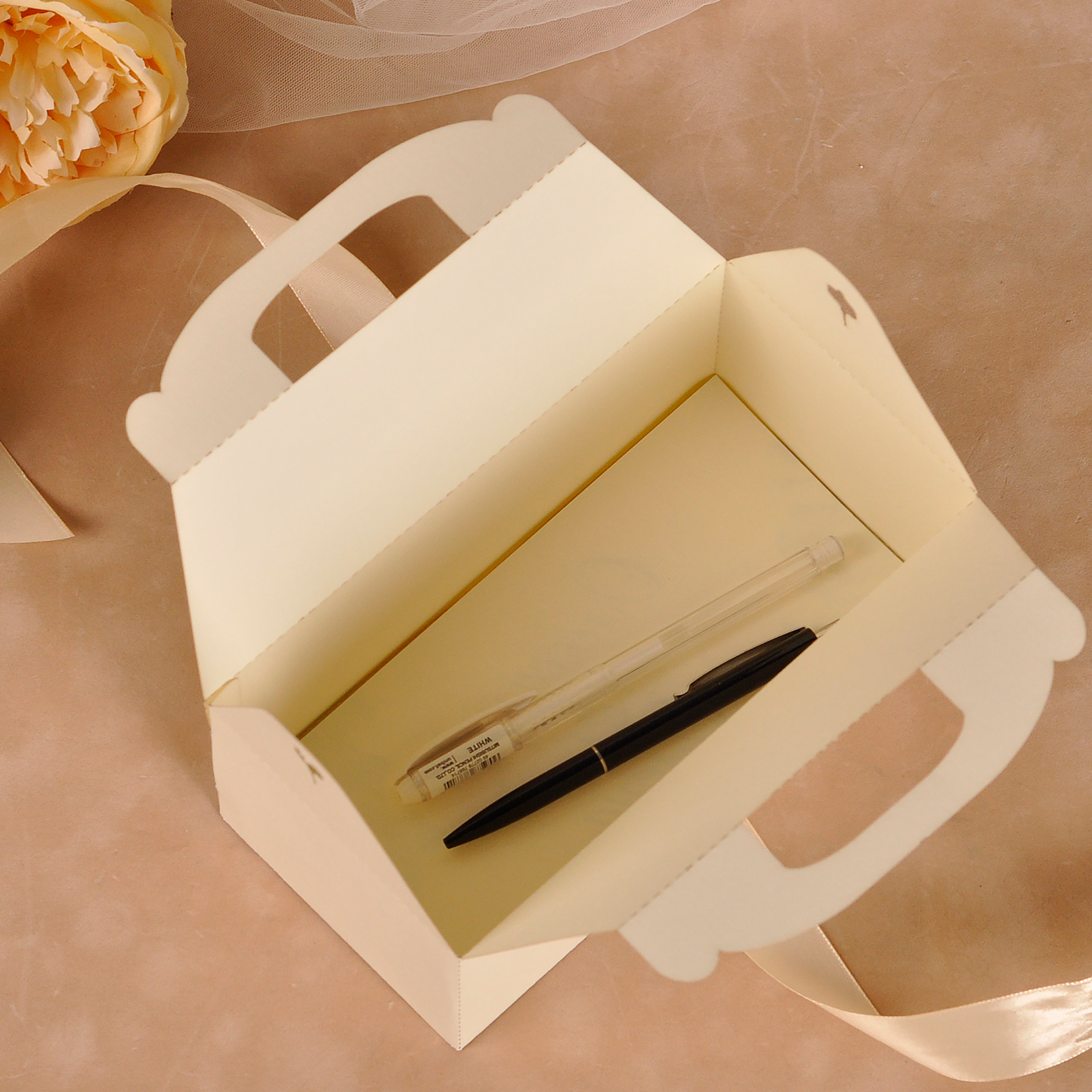 Коробка для солодкого на весілля з ініціалами і датою весілля - це не тільки чудовий спосіб презентувати солодкий комплімент кожному гостю, але й зберегти його свіжість та форму під час транспортування. Вона легко складається і розкладається, що забезпечує зручність використання. Кожна коробка має достатній розмір, щоб вмістити солодкі сюрпризи для вашого гостя.