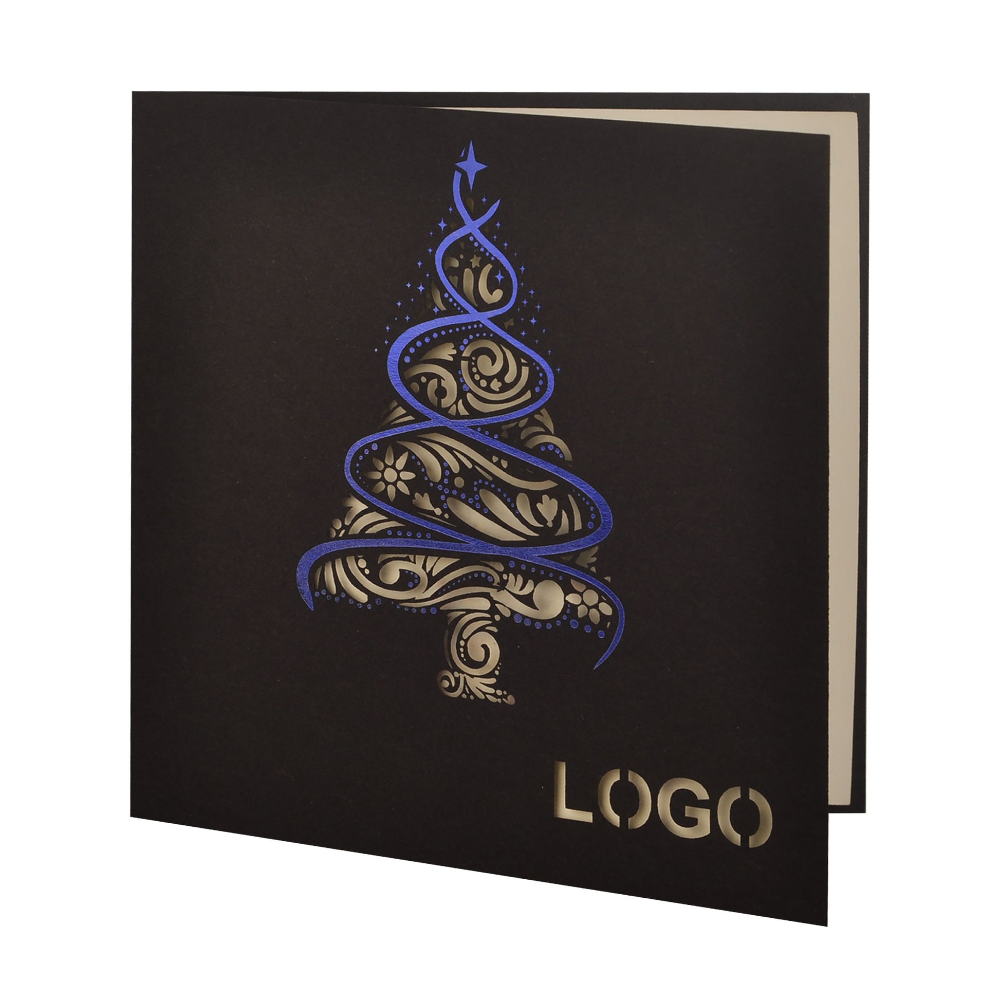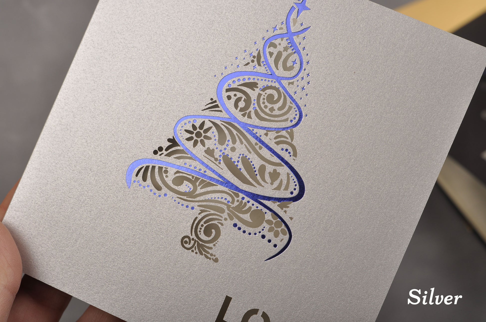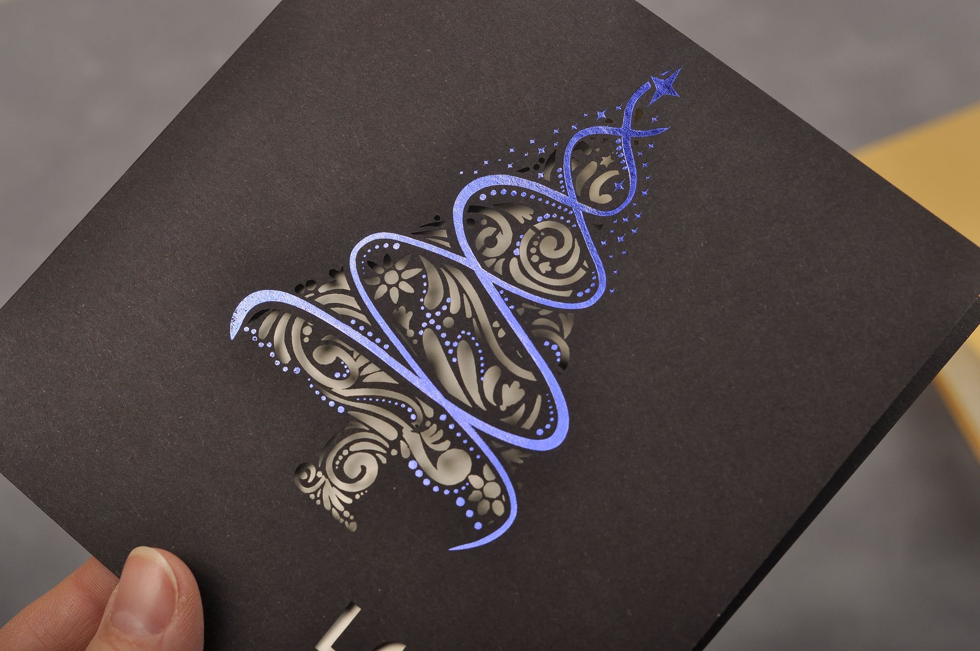 Ця новорічна листівка - справжнє втілення святкової магії. В новорічній листівці поєднюється тиснення золотою фольгою новорічних елементів та лазерна висічка філігранних елементів листівки.