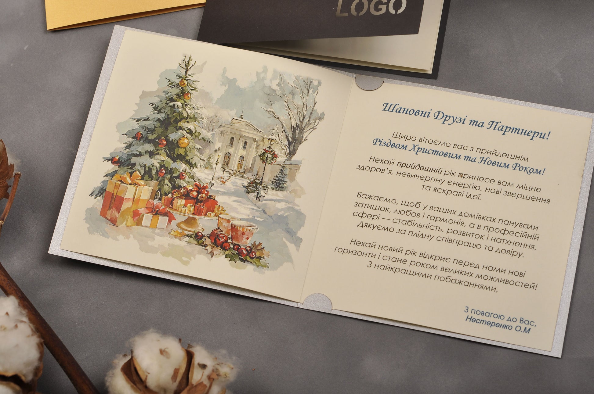 Ця листівка - ідеальний спосіб привітати і подарувати святковий настрій вашим партнерам, друзям та колегам. Ви можете залишити свої особисті привітання всередині листівки, додати її до подарунка або надіслати окремою поштою.