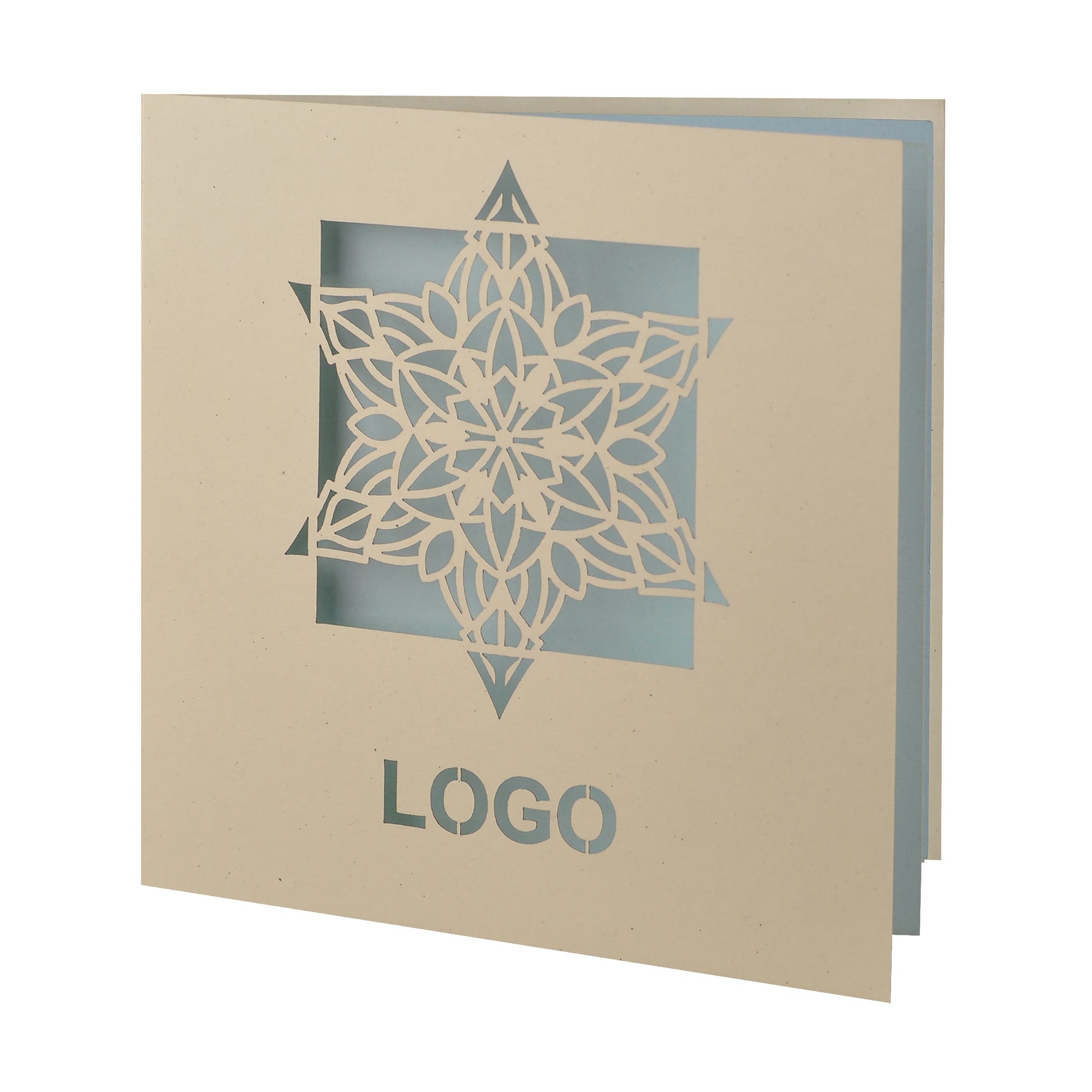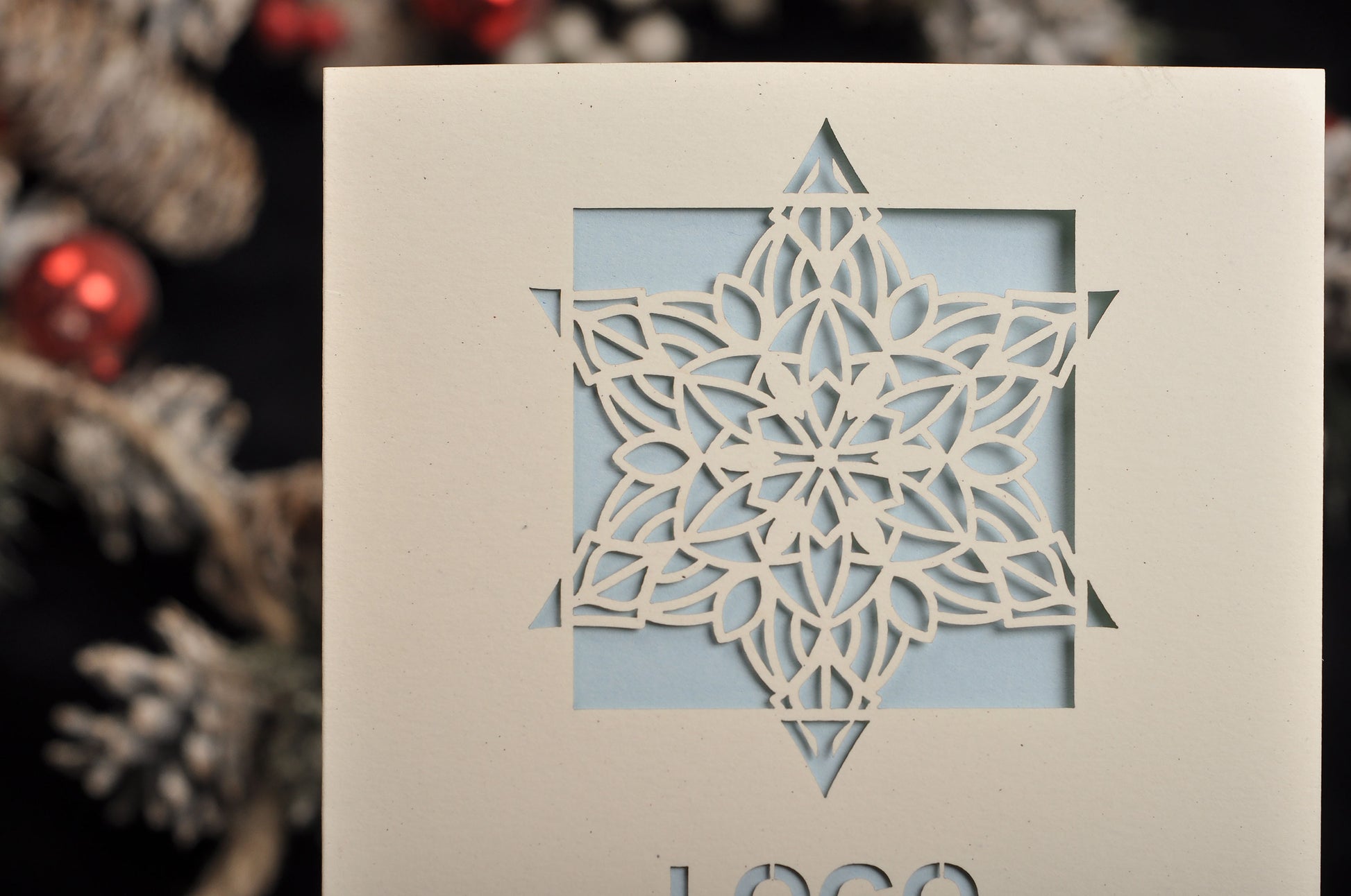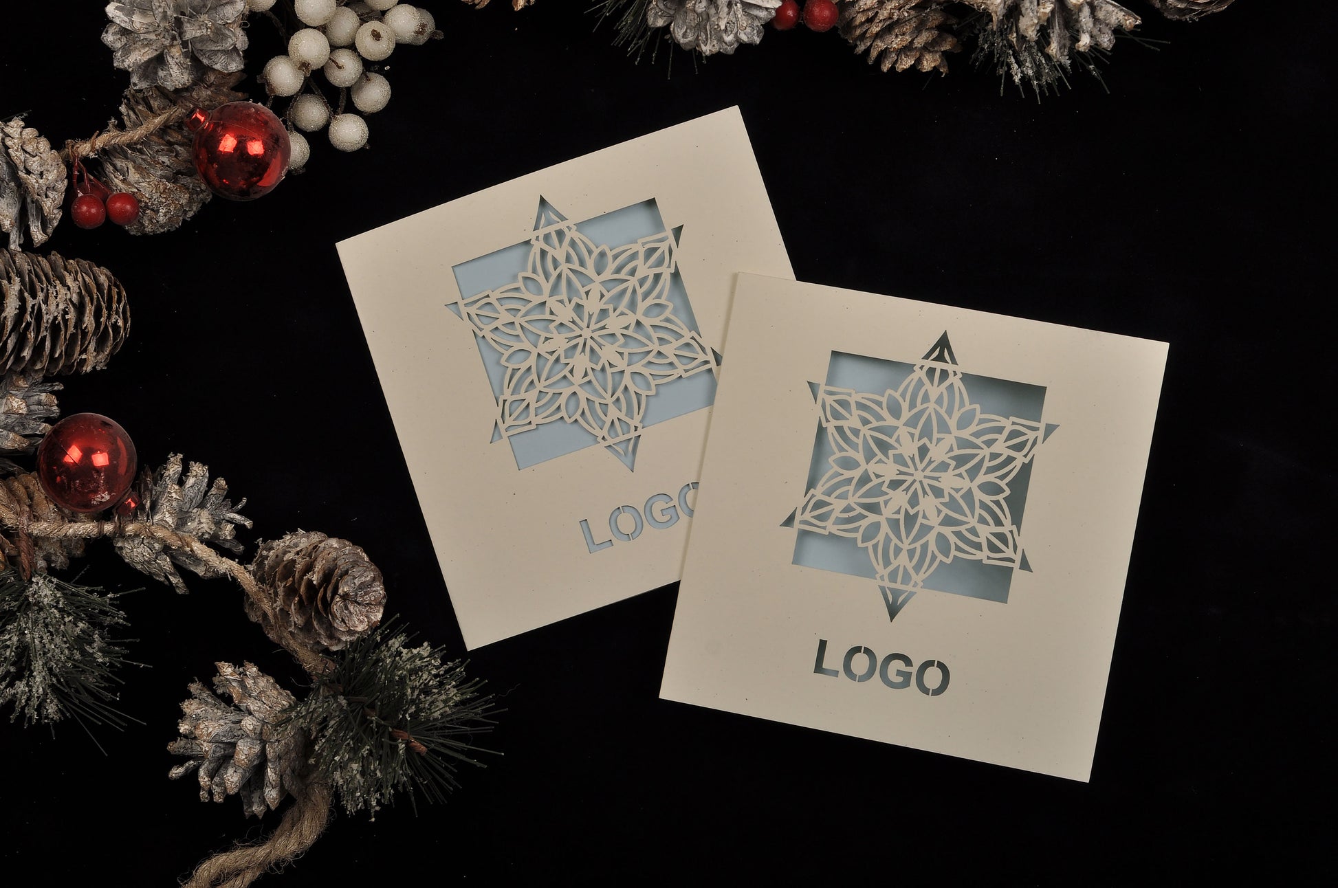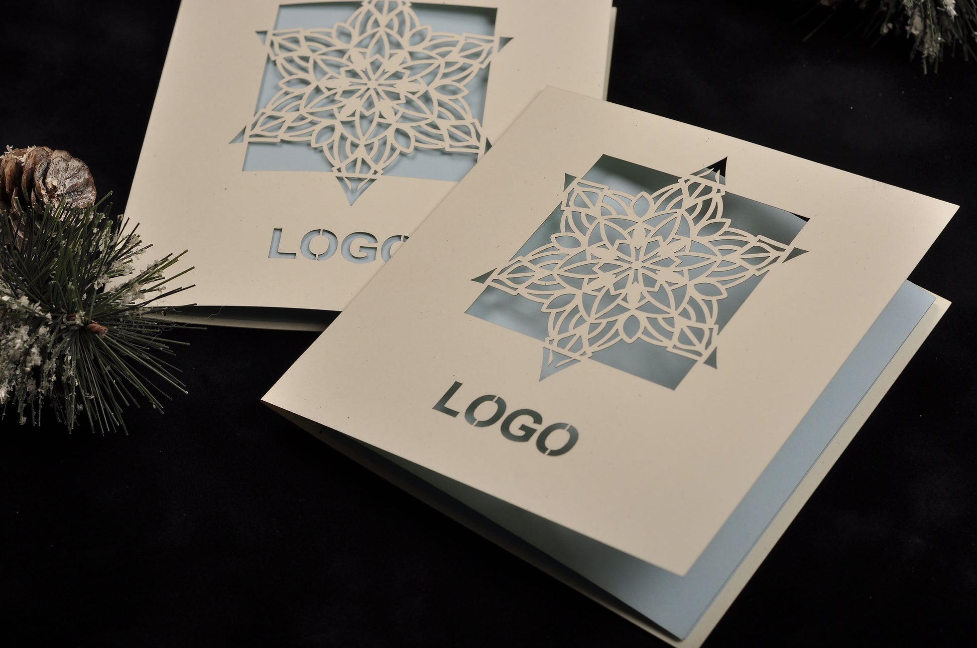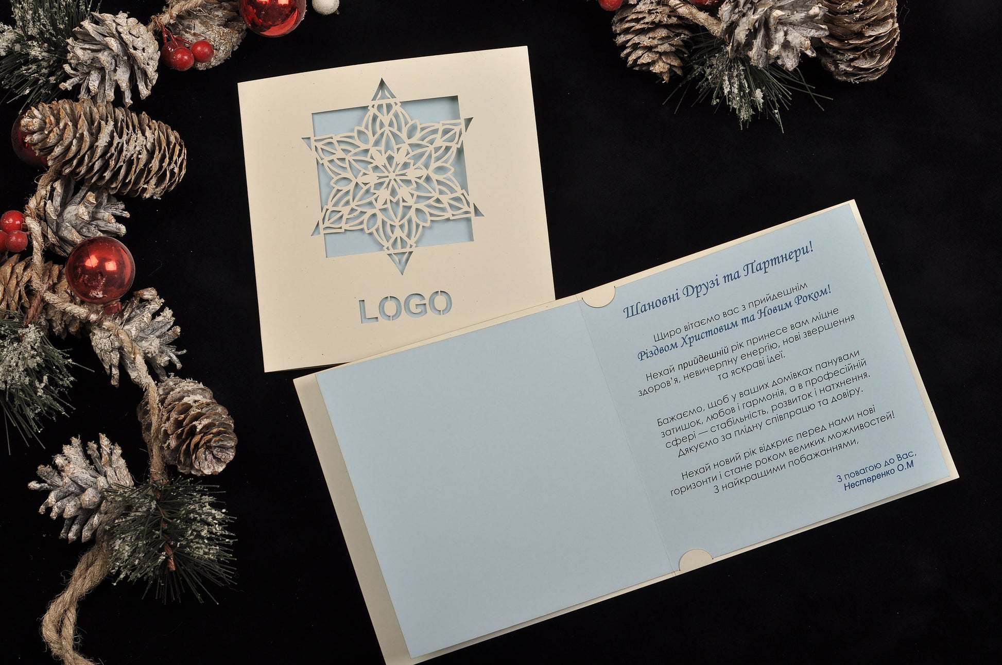 Ця новорічна листівка - справжнє втілення святкової магії. Вітальна новорічна листівка виконанана методом лазерної висічки. Ви маєте можливість на обкладинку додати ваш логотип та всередині може бути надрукований ваш текст.