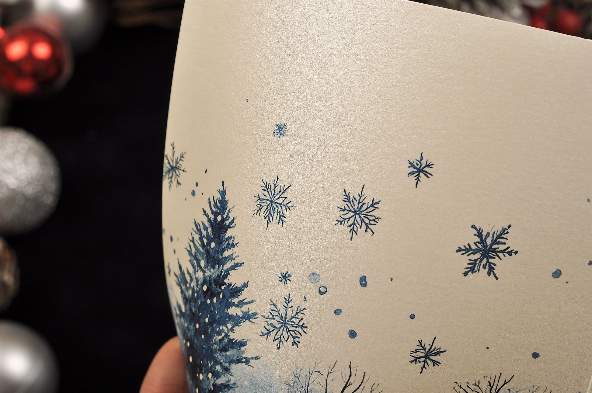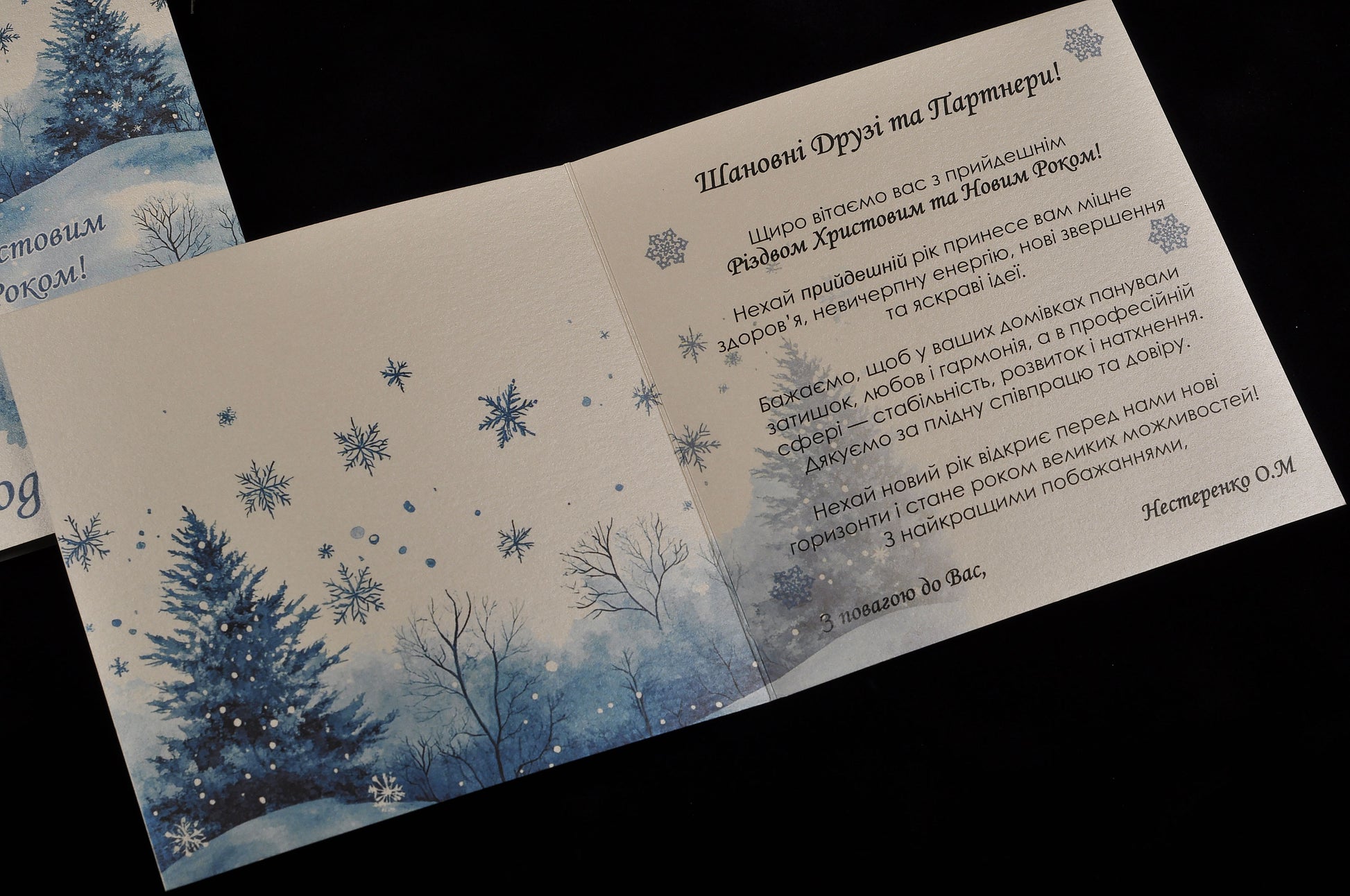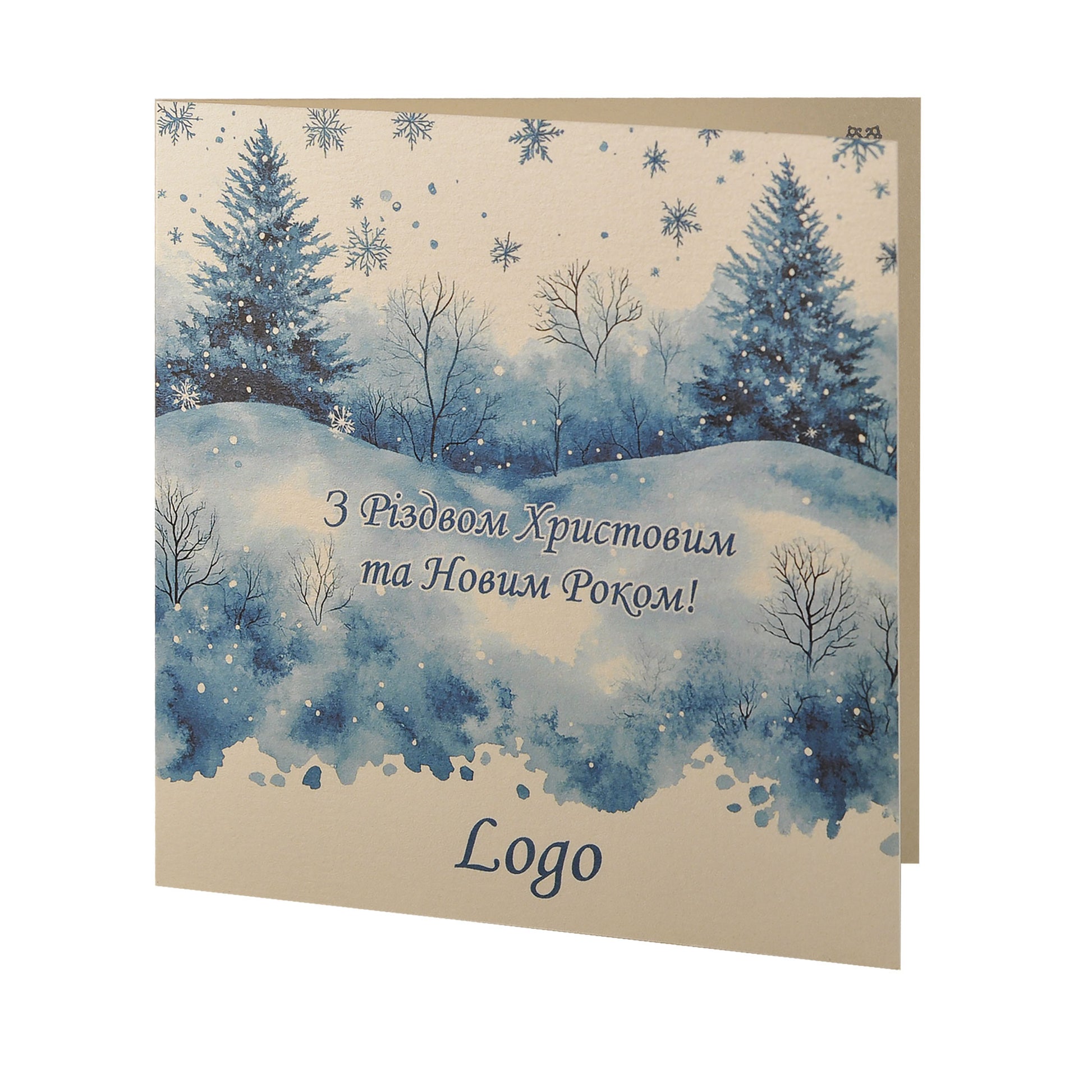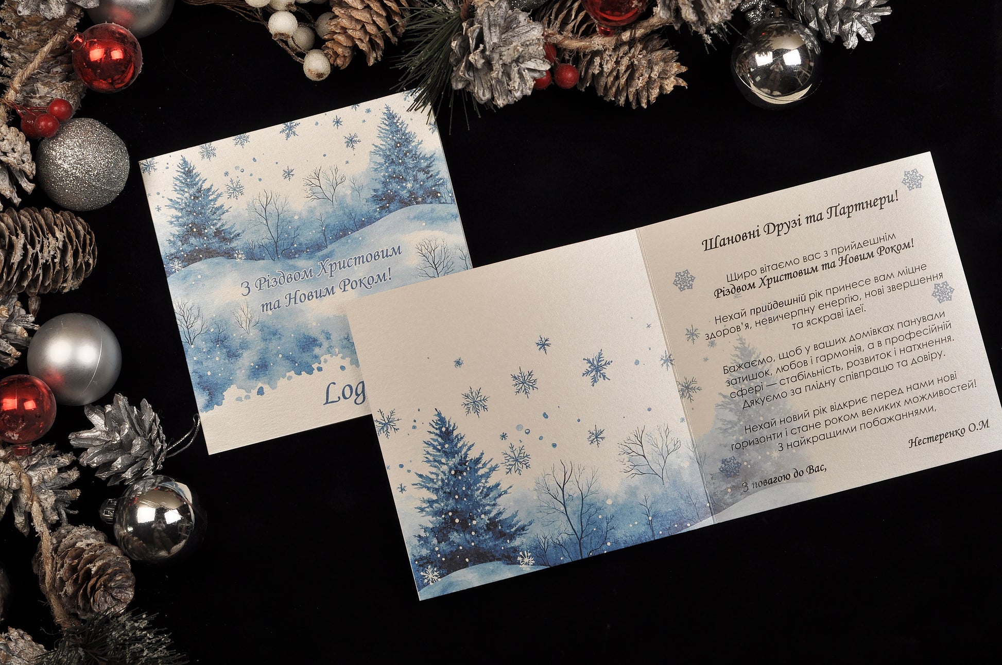 Листівка виготовляється з металізованого дизайнерського картону з вашим індивідуальним текстом і логотипом. Вартість друку тексту та логотипу входить у вартість листівки. Також можливо додатково замовити друк на конверті.