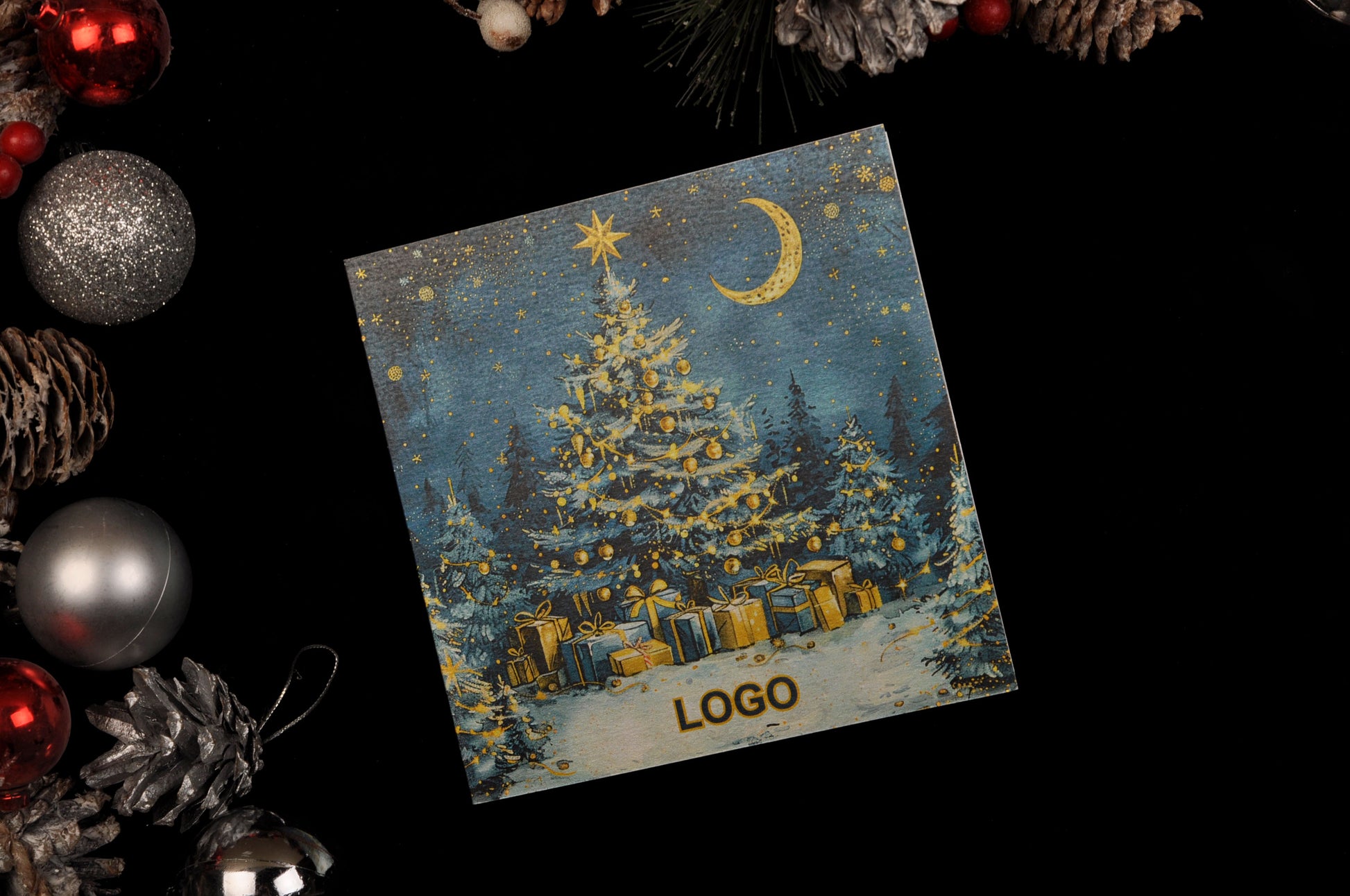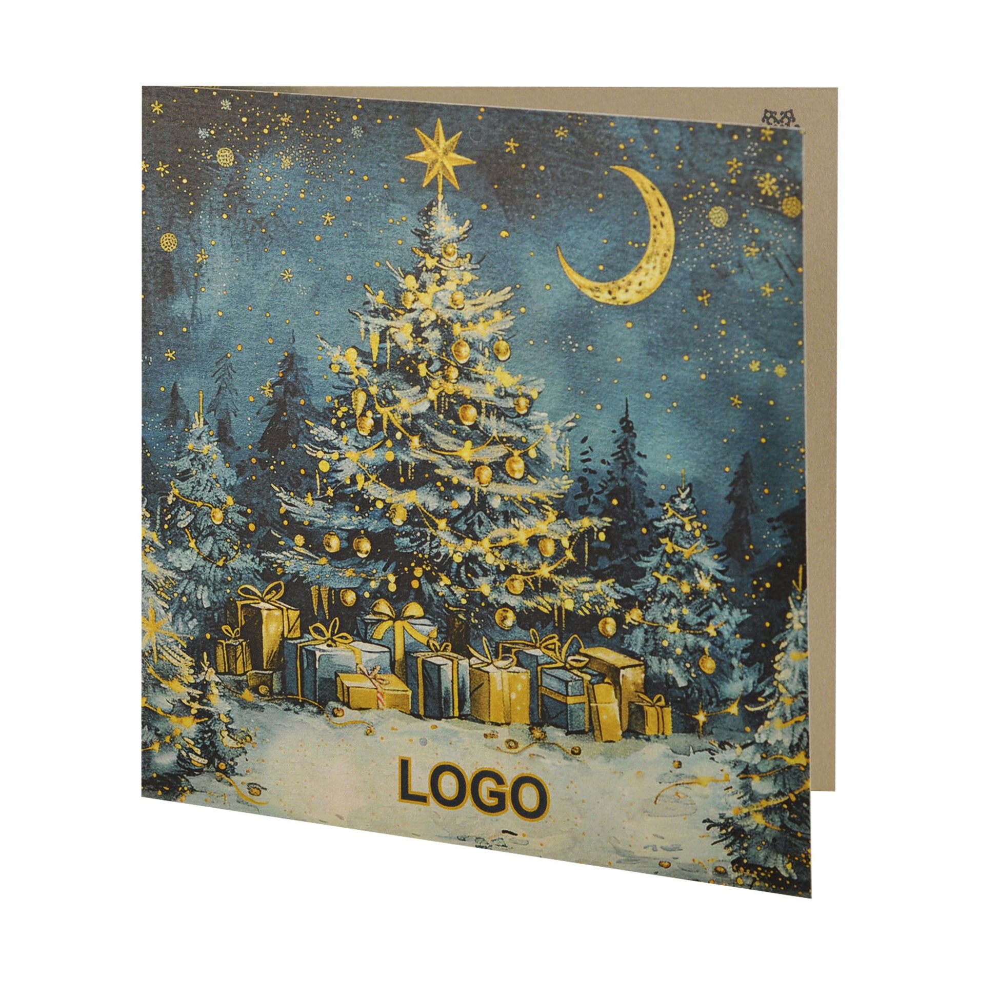 Листівка виготовляється з металізованого дизайнерського картону з вашим індивідуальним текстом і логотипом. Вартість друку тексту та логотипу входить у вартість листівки. Також можливо додатково замовити друк на конверті.