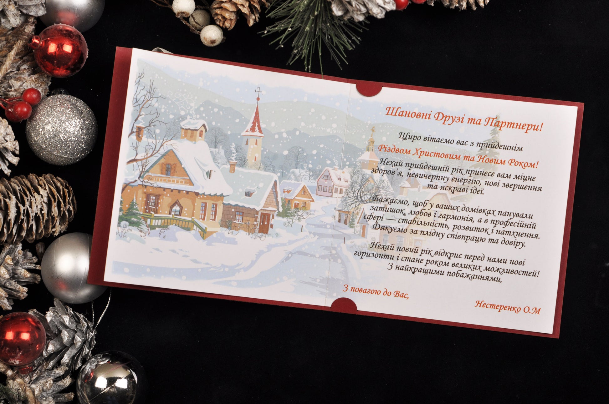 Ця листівка - ідеальний спосіб привітати і подарувати святковий настрій вашим партнерам, друзям та колегам. Ви можете залишити свої особисті привітання всередині листівки, додати її до подарунка або надіслати окремою поштою.